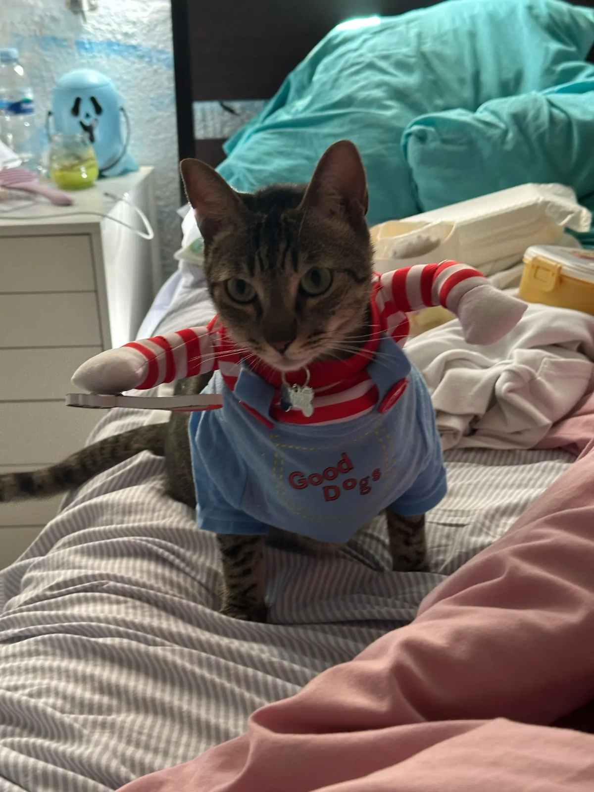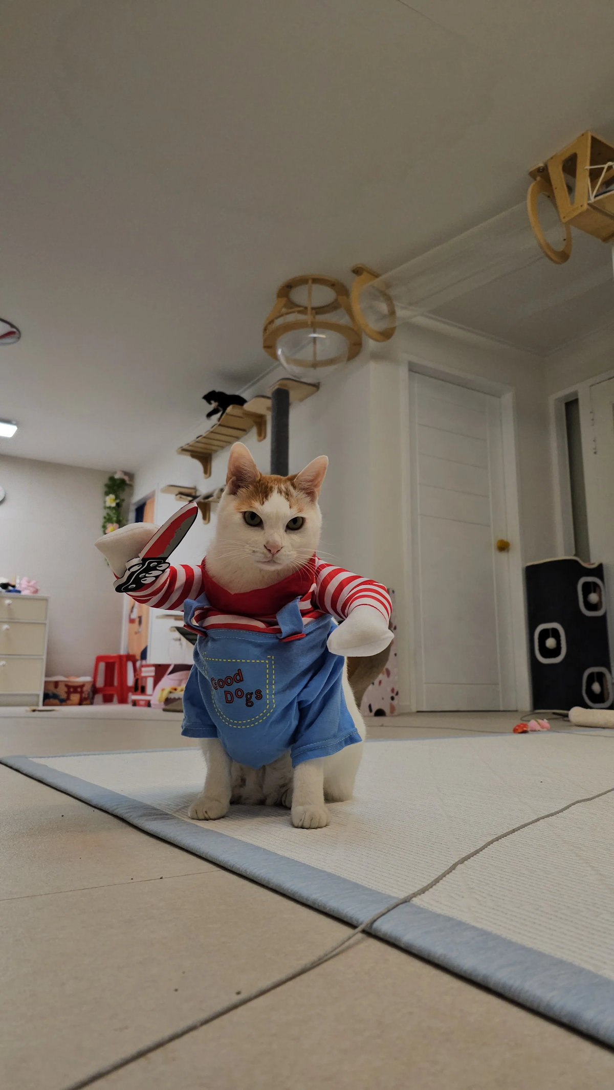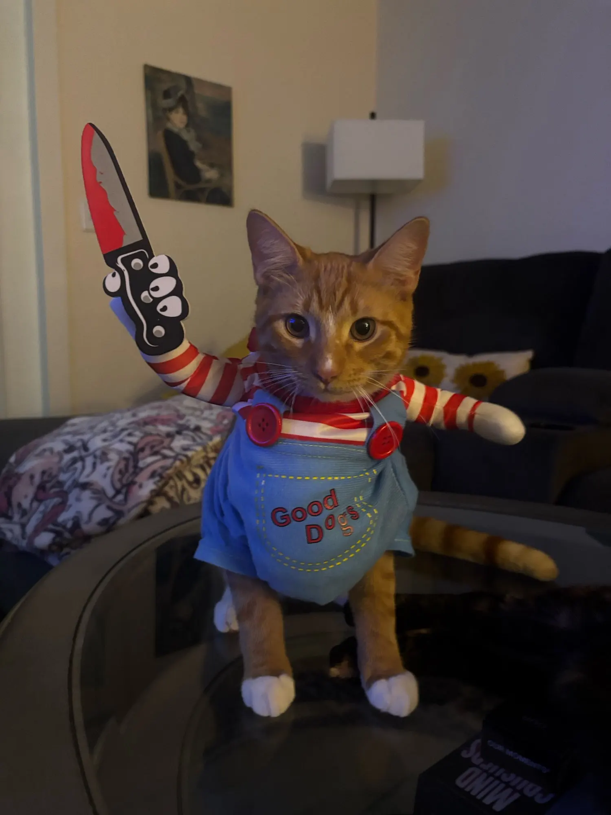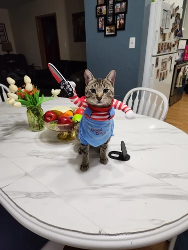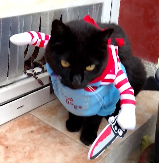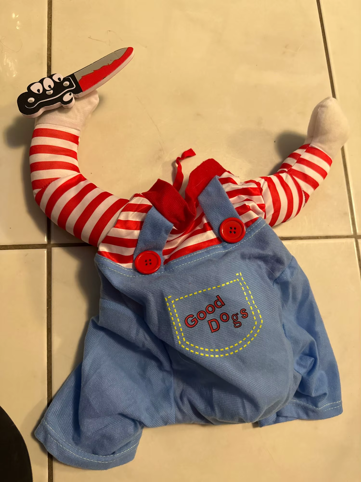 Forvandl din Halloween med det ultimative Chucky-kæledyrskostume. Din lodne ledsager vil være den mest uhyggelige og elskelige og skabe uforglemmelige minder natten over.